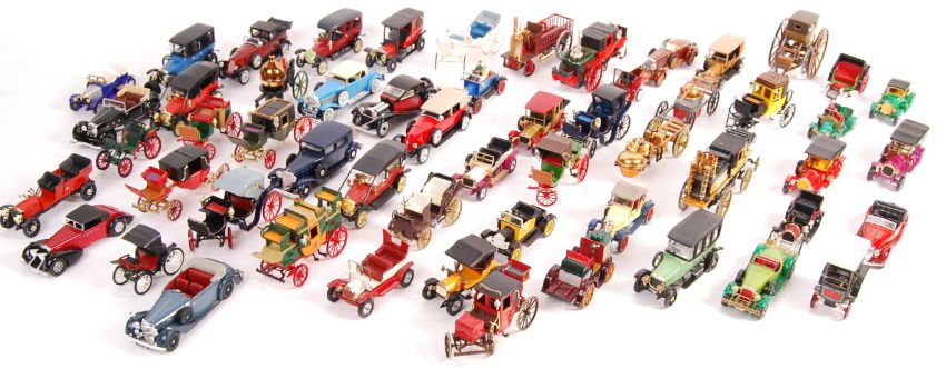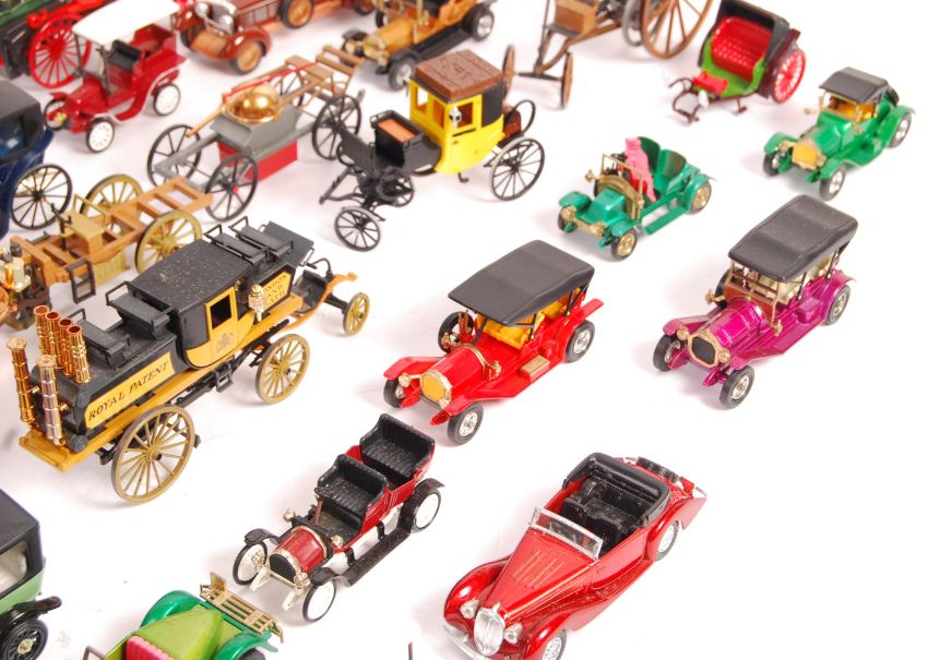 A collection of approx 50 1/43 scale diecast model veteran cars to include Brumm, Solido, Matchbox, Rio. Dinky Various classic and antique horse drawn carriage vehicles present. All models in displayed condition some with missing parts but overall good. Great collection.