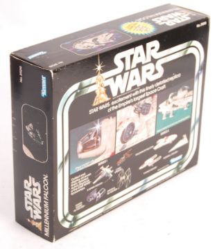 An incredible ex-shop stock condition Kenner made vintage Star Wars ' Millennium Falcon ' diecast metal and plastic model ship. The best condition of this model we've seen, it comes fully factory sealed, within it's original box - the contents mint and untouched. Outer box very near mint, with just some light scuffing. Remarkable example. Rare.