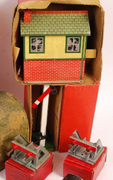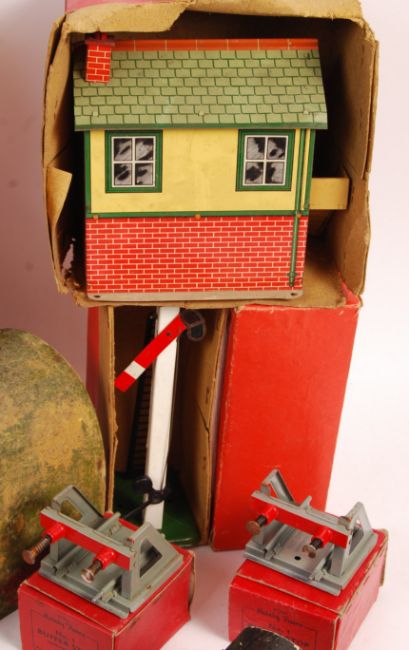 A collection of assorted vintage Hornby Series 0 gauge model railway items - some boxed, to include; x3 clockwork locomotives (x2 AF), various tinplate stations and buildings, a small selection of track, composition tunnel, boxed signal and other items. Interesting collection.