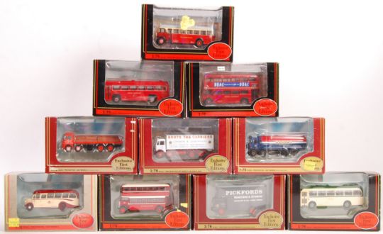 A collection of ten boxed EFE Exclusive First Editions 1/76 00 Gauge model railway scale diecast model buses comprising: 31201, 23302, 30102, 15601, 20133, 23603, 24319, 11007, 18402 and 27205. All models appearing mint in good boxes. Good collection.