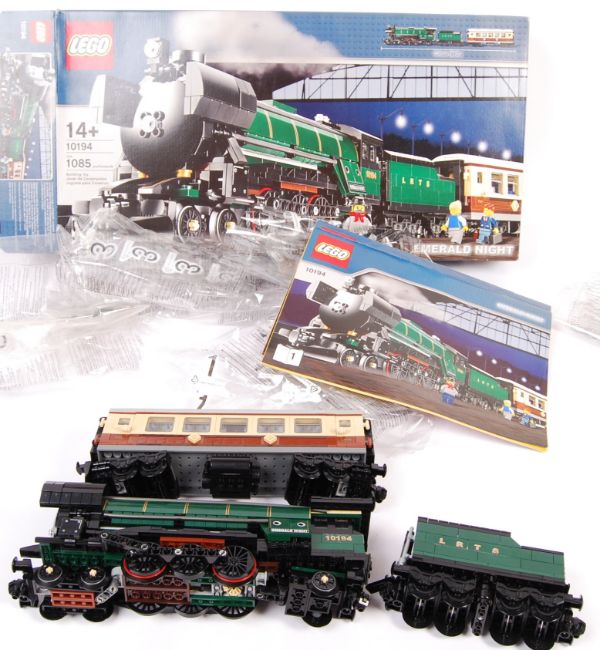 A rare Lego made train set No. 10194 ' Emerald Night '. Presumed 100% complete, as fully made - still includes all the original Lego bags and complete with instructions. Sold as unchecked. Outer box mint. A rare and highly detailed Lego set.