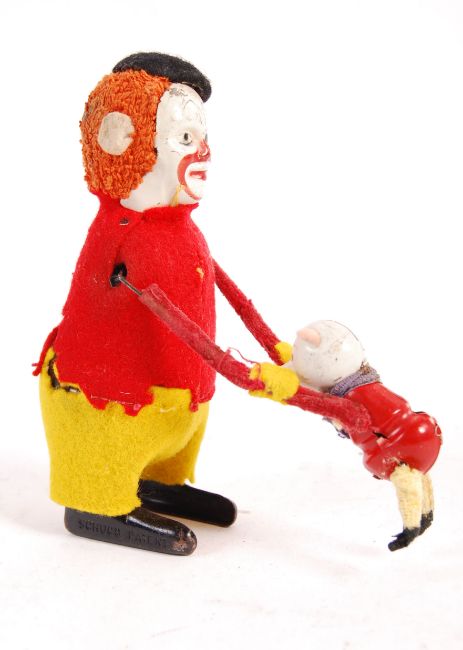 A rare antique vintage 1930's pre war German Schuco made clockwork tinplate wind up toy No. 988 Dancing Clown with acrobatic mouse / child Figure is in good condition with wear to clothing and face . In working order. No key present. Measures: 12cm.