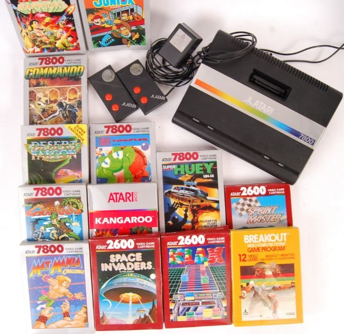 A vintage Atari video computer games console with official A/C adaptor, 2x control pads and an aerial cable along with 13x games to include; 7800 Nintendo licensed Donkey Kong Junior, 7800 Commando, 7800 Ikari Warriors, 7800 Desert Falcon, 7800 Tower Toppler, 7800 Crossbow, 7800 Kangaroo, 7800 Super Huey UH-IX, 7800 Mat Mania Challenge, 2600 Klax, 2600 Space invaders, 2600 Sprintmaster and Breakout. All boxed with manuals.