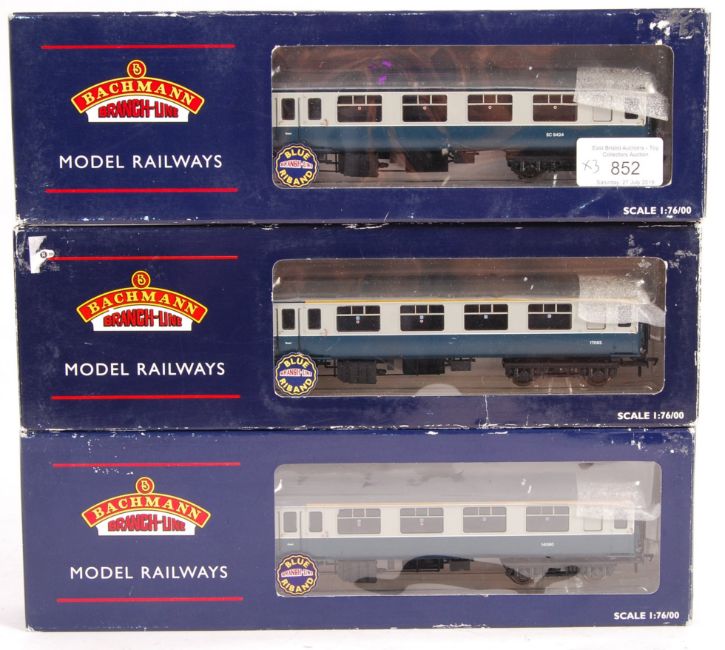 A collection of three Bachmann Branch Line model railway train set boxed Intercity passenger coaches / carriages 39-401, 39-381 and 39-411. All appearing mint with good original boxes.
