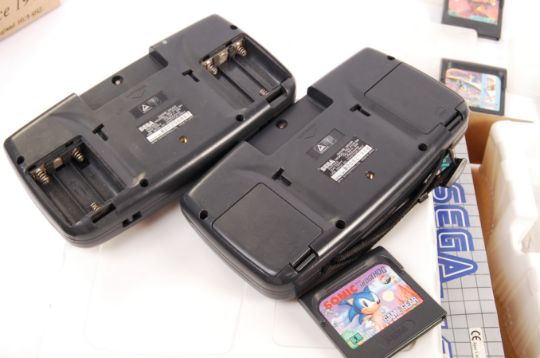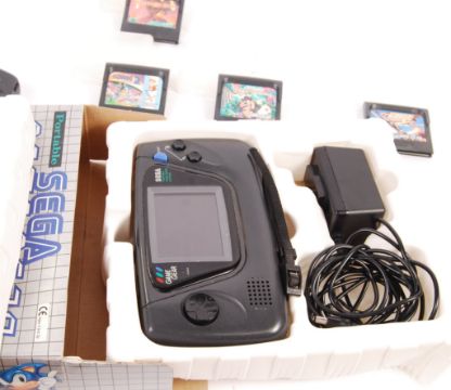 A vintage Sega Game Gear handheld portable video games computer console complete in box with A/C adaptor, console and Sonic games cartridge along with a loose Game Gear and games to include; Taz-Mania, Aerial Assault, Wonder Boy and Sonic The Hedgehog 2.