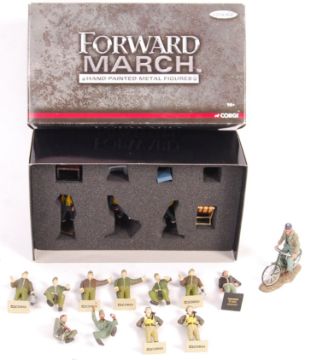 A collection of assorted Corgi 1:32 scale diecast model military figures with a US59108 Heroes WWII The Battle Of Britain Scramble! Vignette (incomplete) along with a 1:30 scale US military officer on bicycle (A/F).