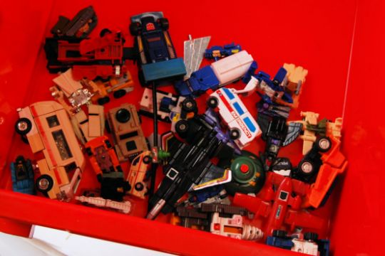 An incredible large collection of vintage 1980's Hasbro / Bandai made mostly Generation 1 / G1 Transformers action figure toys. To include; Jetfire,Snarl Dinobot, Sludge Dinobot, Pretenders Landmine, Skullcruncher, Optimus Prime, and many others. Along with a quantity of assorted accessories and weapons. Wonderful collection, a genuine childhood loft-find set of Transformers.