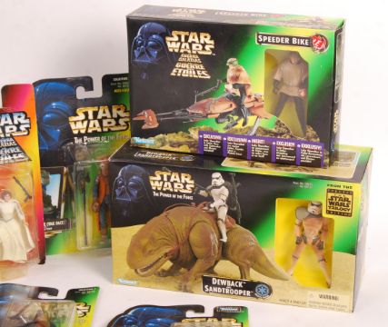 A collection of 10x Kenner made Star Wars ' The Power Of The Force ' carded action figures and boxed playsets. All appear mint, factory sealed and as new. Carded figures to include; Yak Face, Luke Skywalker, Long Snoot and others. Boxed sets include; Speeder Bike and Dewback. Great collection.