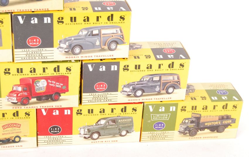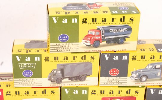 A collection of 10x Vanguards made 1/43 scale precision boxed diecast models. All appearing mint (wing mirrors unattached) and unused, within the original boxes. Includes: VA10004, VA10003, VA9002, VA8008, VA14004, VA8006 and others. Good collection.