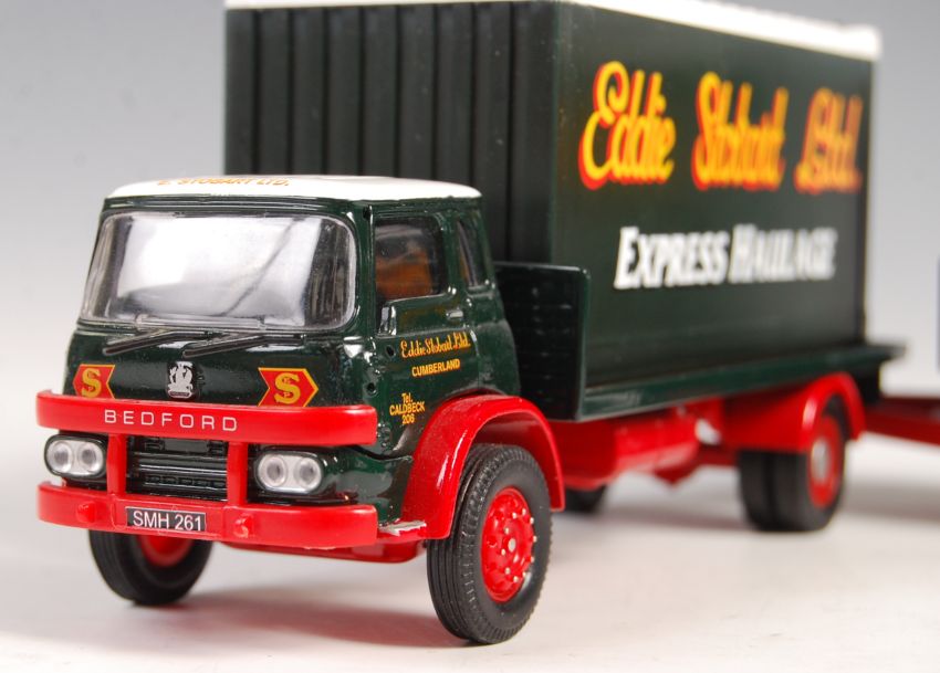 A rare original Corgi pre-production / prototype ' Code 3 ' Eddie Stobart haulage diecast model - Bedford KM 4 Wheel Flatbed and 4 Wheel Trailer, with x2 Containers. All in Eddie Stobart livery. Within an associated box. NOTE: From a large collection of ' pre-production / prototype / Code 3 ' haulage related diecast. Originally purchased from a gentleman associated with Corgi some years ago, it is generally believed by the vendor that each model is a ' sample ' which was made for approval by Corgi. Some went in to full production, others didn't. Many are supplied in associated (incorrect) Corgi boxes, others are unboxed. Wing mirrors are either fitted or supplied unused, or not present. All should generally be considered to be ' mint ' but some may have wear - buyers are reminded for the need to satisfy themselves on this matter prior to bidding. A great collection.