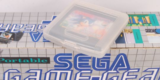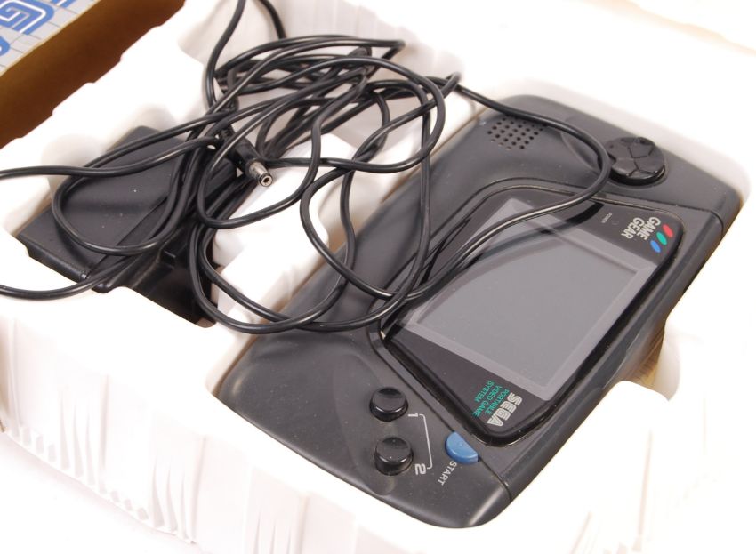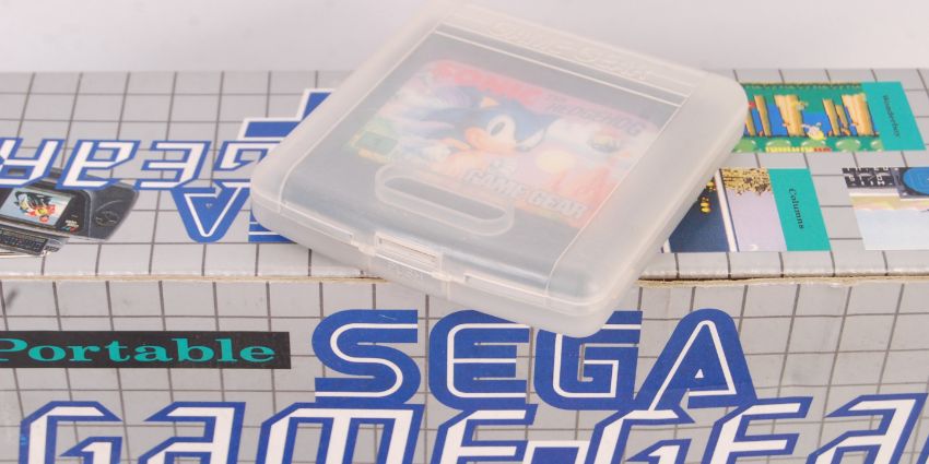 A vintage Sega Game Gear handheld portable video games computer console complete in box with A/C adaptor, console and Sonic game cartridge along with 2x boxed games to include; Shinobi and World Class Leaderboard.