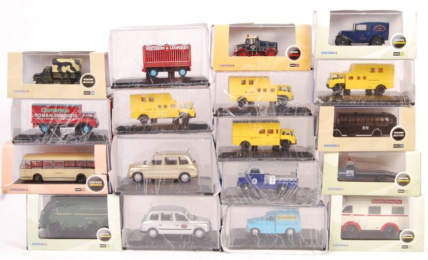 A collection of 18x Oxford Diecast boxed scale diecast models including Roadshow, Chipperfield Circus, Military, Omnibus, Showtime, Commercials etc. All appearing mint in good original case boxes. Good collection.