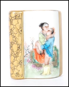 A 20th Century Chinese paperweight in the form of a book having an erotic scene with gilt details. Measures 6.5cm.