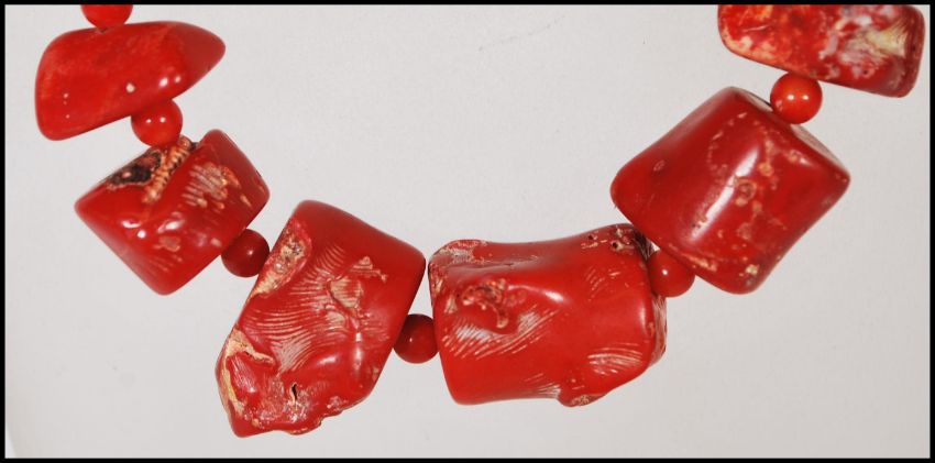 A vintage coral necklace consisting of threaded coral pieces with red bead spacers and stamped 925 silver hook and eye clasp.