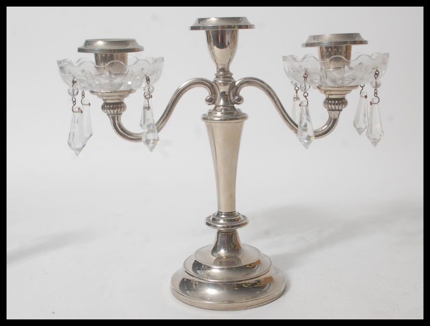 A cut glass 19th Century Victorian silver hallmarked perfume bottle together with a silver hallmarked base stem vase and a silver plated three sconce candelabra. Measures 23 cm high x 26 cm wide x 8.5 cm deep.
