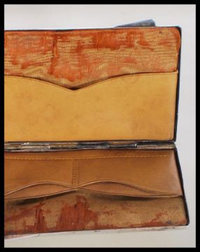 A stamped 800 silver Egyptian wallet / money case having engraved decoration to the front of palm trees and the pyramids of Cairo, the interior having leather and satin dividers. Total weight 75.8g. Measures 9.5 x 6cm.