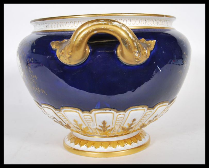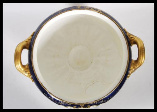 A late 19th Century Royal Worcester soup tureen of large form, having twin carrying handles finished in gold gilt, with a hand painted scene of two Asian pheasant to both sides in a gilt border on a cobalt ground with further gilt detailing throughout, raised on a circular footed base. Markes to base Signed AG in gilt to base.