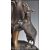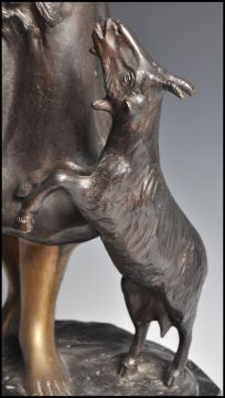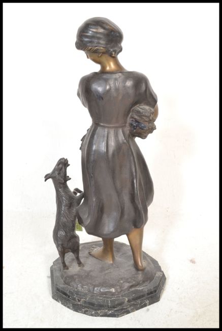Ferdinando de Luca - Italian 20th Century. A large Art Deco bronze sculpture statue figurine in the form of a girl and ngiat raised on naturalistic plinth base other stepped octagonal marble base. Signed to base. The girl modelled in traditional dress and bonnet holding a wheatsheaf with goat raised on two legs. Measures 61cm high.