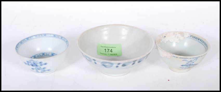 A group of 19th and 18th Century Chinese porcelain tea bowls to include two Tek Sing cargo blue and white bowls being hand painted with floral sprays having Nagel auctions Tek Sing lot labels and one certificate of authenticity along with a Nanking cargo bowl retaining original Christies auction lot number.