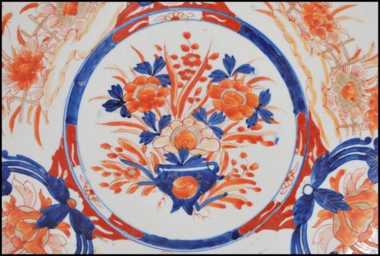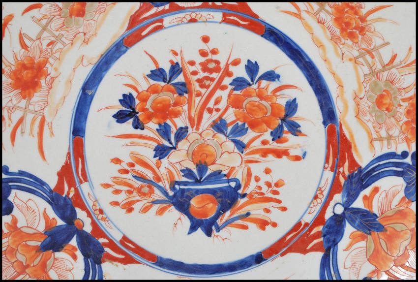 A large 18th /19th Century Chinese export Imari charger decorated with bold vase of flowers and floral and hatched borders. Measures: 46cm diameter.