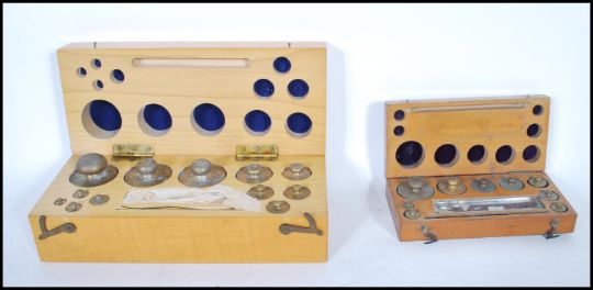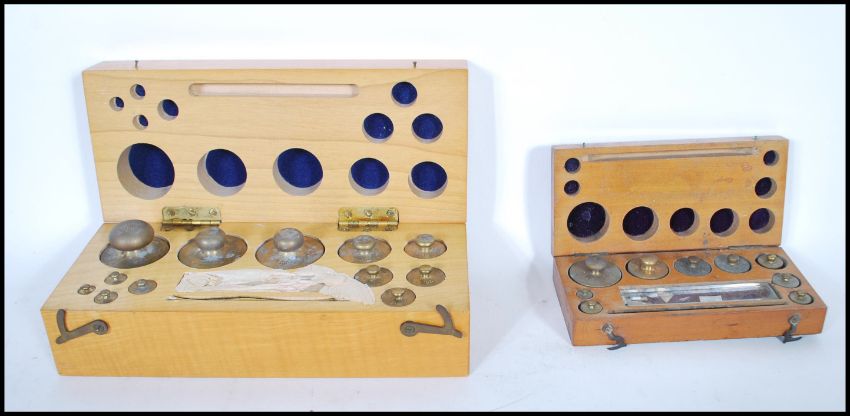 A set of vintage 20th century Apothecary / scientific brass weights starting from 1g to 500g complete in the wooden carry / presentation case. Together with another smaller brass set starting from 1g to 100g, set in wooden carry / presentation case.