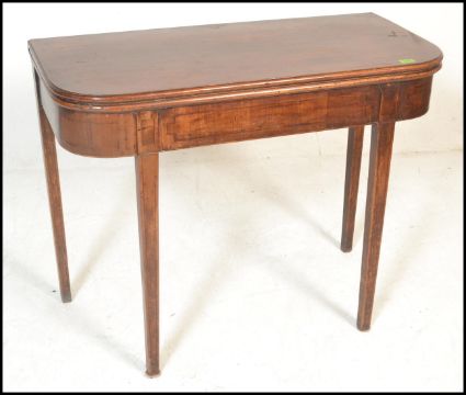 A 19th Century Georgian mahogany line inlay demi lune fold over tea / card games table raised on  square tapering  legs with metamorphic gate leg action.