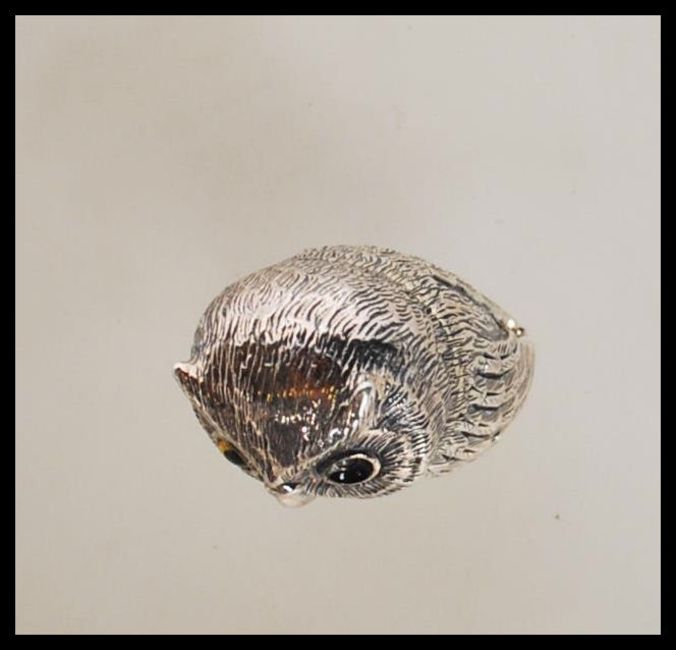 An unusual silver figurine  of an owl with glass eyes. Weight 18.0g.