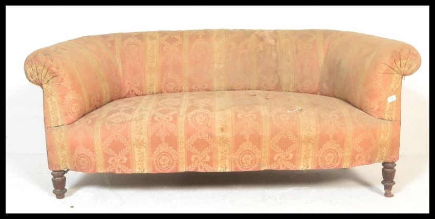 A late 19th / early 20th Century Chesterfield two seat sofa settee being upholstered in a period style fabric and raised on low turned supports. Measures 70cm high x 147cm wide x 75cm depth