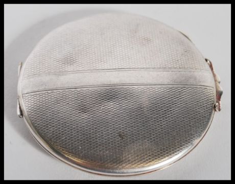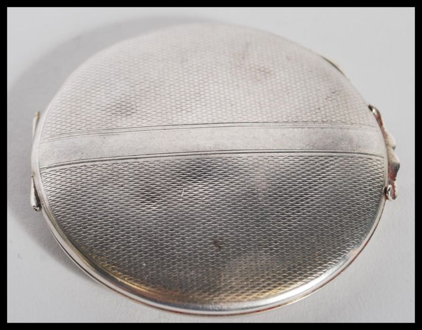 A silver hallmarked lroundel shaped ladies powder compact with inset mirror to the lid, powder compartment with door inside. Engine turned with central monogram. Measures 7cms diameter
