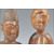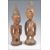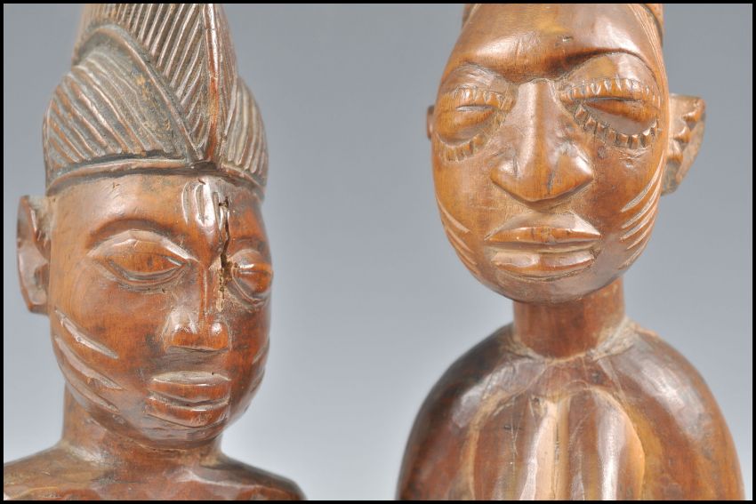 A pair of 19th Century Yoruba Ibeji Southwest Nigerian carved wooden male and female figures. The male figure with typical headdress and scarification to face and lower belly. The female with unusual headdress with scarification to face and belly and eyelashes detail. Measures 29cm high.