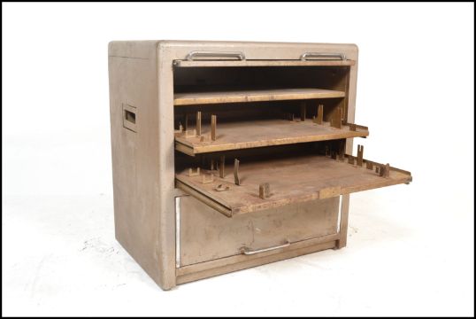 A vintage mid 20th Century industrial enamelled metal sectional tool chest, the chest fitted with two up and over doors, opening to reveal a series of pull out trays. Measures 77cms x 75cm x 55cms.
