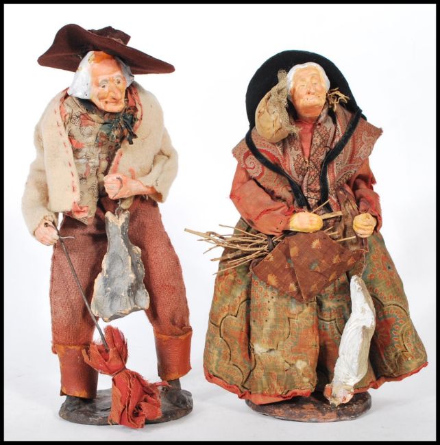 A pair of pottery made Simone Jouglas figures in the form of an old man and women farmers, the lady carrying a chicken and sticks, both having rustic fabric cloths. Raised on circular bases, both signed.