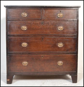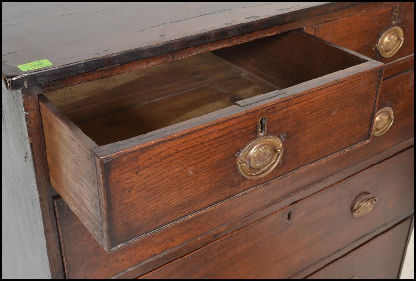A good 18th / early 19th century oak chest of drawers . Raised on bracket legs the upright chest with a configuration of 2 short over 3 deep drawers all with brass swing handles having fleur de lys back plates Oak lined drawers with hand dovetail construction. Measures 106cm high x 101cm wide x 156cm depth.