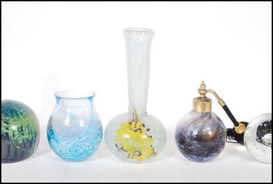 A collection of 20th Century glass wares to include paper weights and vases to include three Mdina pieces including two swirl paperweights and a yellow and white mottled glass vase, and a selection of similar paperweights.