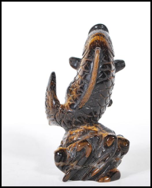 A 20th Century Chinese carved tigers eye ornament in the form of a koi carp fish jumping from the waves. Measures 9 cm high.