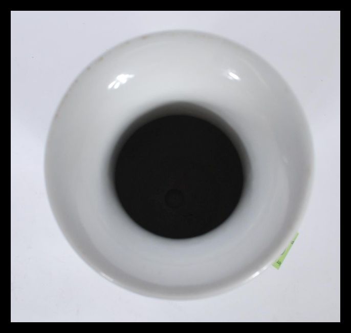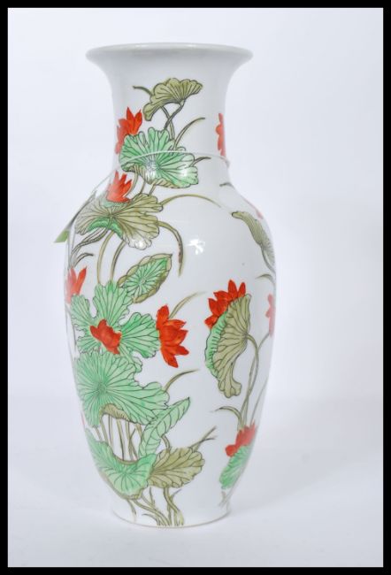 A early 20th Chinese porcelain vase being of tapering form and flared top, having white ground with hand painted foliate decoration finished in red and green. Marks to base. Measures: 26cm tall.