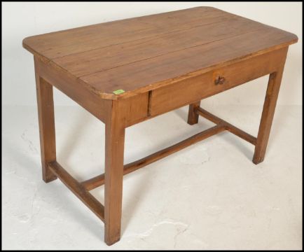 A 19th century French fruitwood  dining table. Raised on squared legs united by stretcher having a fitted frieze with single drawer and planked table top above. Measures: 76cm high x 120cm wide x 65cm deep.
