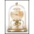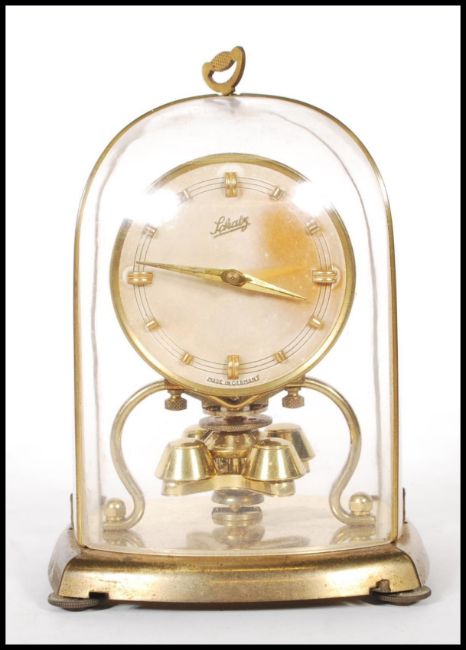 A vintage 1950's German Schatz glass domed anniversary clock having with round faced clock to the inside raised on scrolled brass legs. Measures 16cm tall.