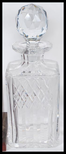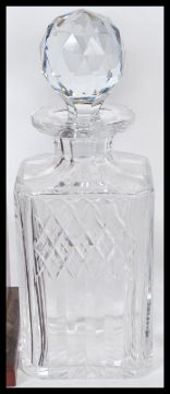 A collection of 20th century decanters to include facet cut, cut glass crystal and other shapes all with stoppers together with a modern tantalus complete with 2 glass matching decanters. Measures: 32cm tall.