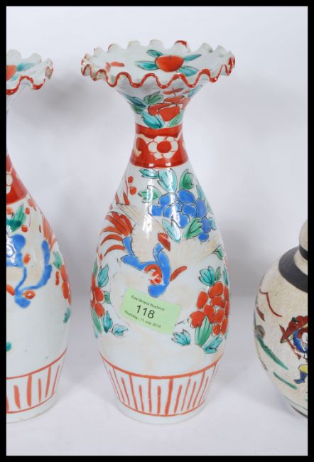 A pair of late 19th / early 20th Century Japanese vases having fanned and flared rims with hand painted floral sprays in red and green along with three crackle glazed ginger jars to include two being decorated with warrior scenes along with a phoenix jar, two with lids. Measures: 25cm tall