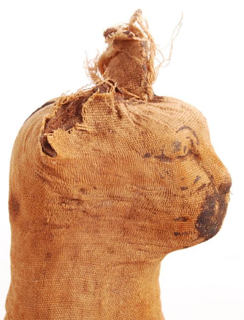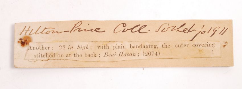 Ancient Egypt - a incredible two thousand five hundred year old Ancient Egypt / Egyptian mummified cat - similar to examples dating from 400BC. Ex-Hamilton Price collection, as sold at Sotheby's in 1911. This cat referenced in Prices' 1897 catalogue of artefacts as 'Another; 22in high; with plain bandaging, the outer covering stitched on at the back; Ben-Hasan; (2074)' The original wrappings carrying a label which reads 'From Fayoum - June 10th 1899' and has a relevant catalogue number of '2074'. The cat comes with it's full original linen wrapping (some staining and expected age related marks). The face of the bandages has been shaped and formed into that of a cat, with ink decoration. Measures approx; 53cm tall. An incredibly rare and important Ancient Egyptian artefact.