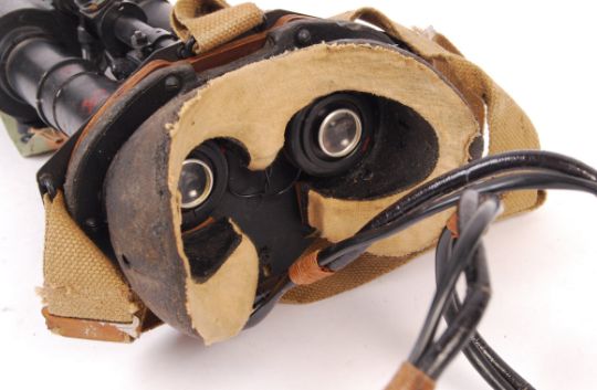 A set of original WWII Second World War MK II ' Tabby ' cast iron night vision infra red tank binoculars having webbing head harness. numbers printed to the plate 'GG 32 ZA 23001' and original paper label from the ministry of supply.