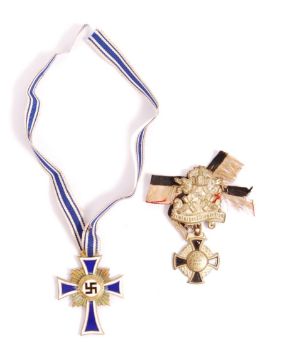 A reproduction WWII second World War German Nazi Third Reich Mothers Cross with blue , white and black enamelling with blue and white ribbon along along with a pre WWI Imperial German Army Deutscher Kriegerbund warrior club.