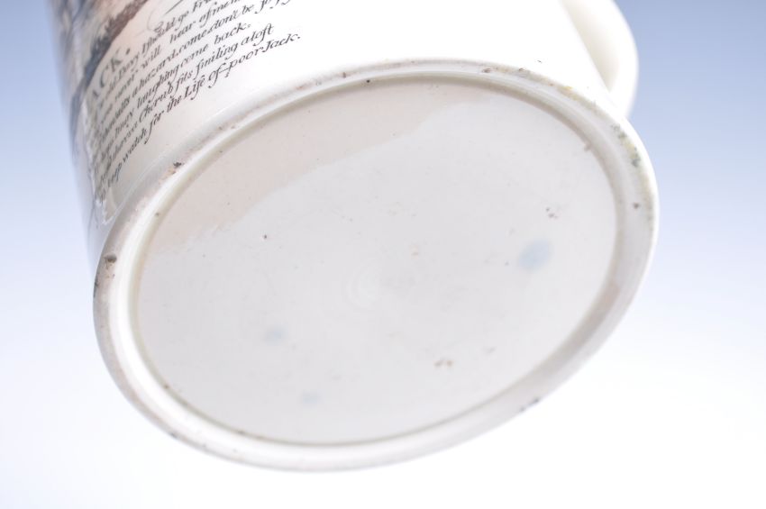 An 18th Century maritime theme creamware tankard of tall cylindrical form having shaped handle depicting Poor Jack with boat and lady. Shaped handle to side. Measures 16cm tall.