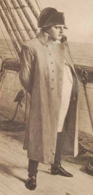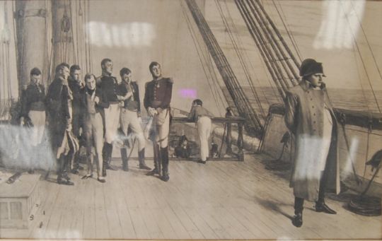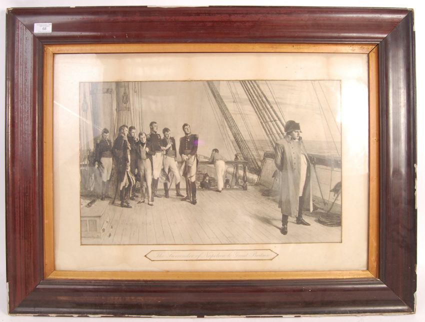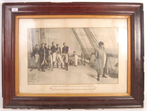 A 19th century framed maritime Napoleonic interest print entitled ' The Surrender Of Napoleon To Great Britain '. Framed and glazed with notation underneath. Frame measures 66cm x 88cm.