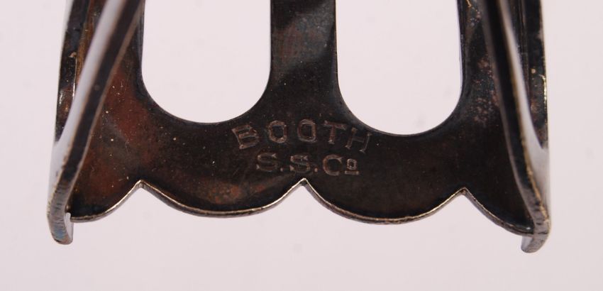 A rare early 20th century Hutton of Sheffield silver plate toast / letter rack from the ' Booth Steam Ship Company '. Impressed makers marks to base, and ' Booth - SS Co. ' to front. Measures approx; 16cm tall x 14cm long.
