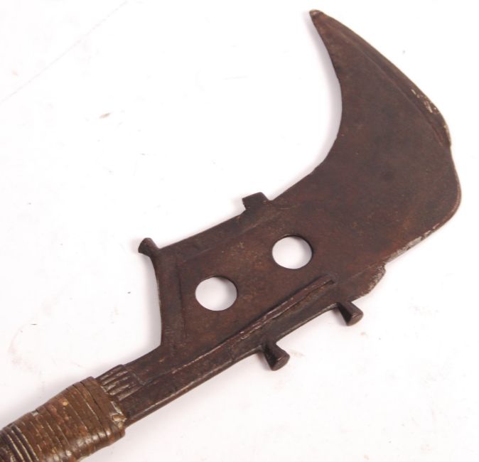 A 19th century African Mangbetu D.R.C Congo sickle ceremonial knife ' Trumbash / Trombash ' having a wrapped metal handle and unusual shaped sickle blade with sharpened double edge and pierced holes. Measures; 39cm.