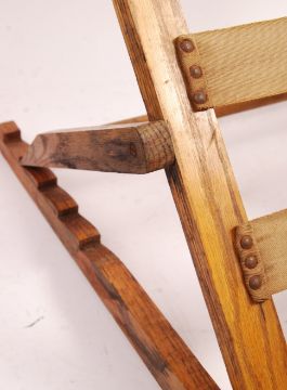 A WWI First World War era medics medical stretcher / bed back prop or rest made of oak and canvas webbing having multiple reclined positions with ivorine plaque to back that reads ' Surgical Manufacturing Co Ltd '.
