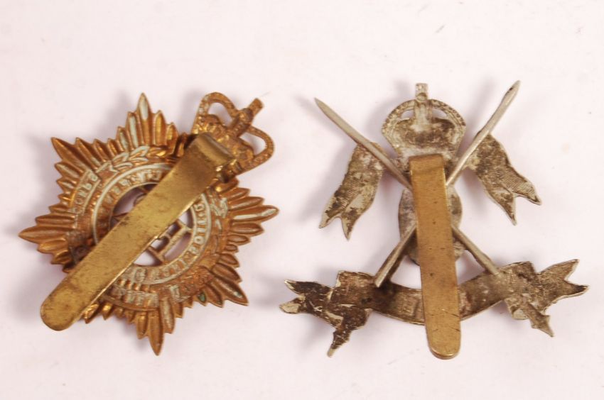 An original rare vintage 9th Queen's Royal Lancers uniform cap badge. Scarce painted example, with red and blue decoration. Number ' 9 ' to the centre, original slider to reverse. Along with an ER RASC Royal Army Service Corps cap badge.
