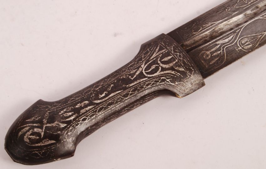 An early 20th century Russian Cossack Kindjal dagger having a metal niello designed hilt with rounded pommel, fullered niello design double edged blade and scabbard having cloth clad and metal scabbard. Measures; 51cm overall.